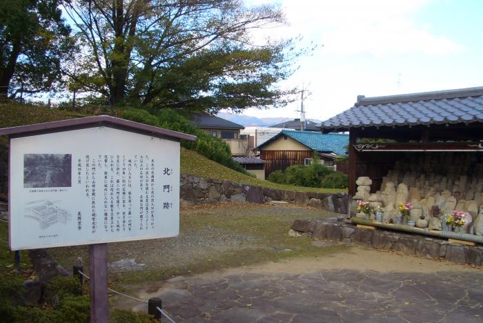 光秀は勝龍寺城に籠城したものの、この小城では秀吉の大軍を支える見込みが立たなかったため、夜間、少数の供を引き連れ、この北門から逃れたと云います。光秀は近江坂本に帰還途中、小栗巣に於いて落ち武者狩りの襲撃を受け、重傷を負って無念の自害を遂げます。