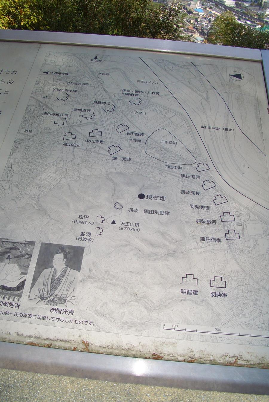 天正10年(1582年)6月13日、この眼下から見下ろす地で、秀吉と光秀の天下分け目の合戦が繰り広げられました。往時には天にも届かんばかりに両軍の喚声がとどろいていた事でしょう。この戦いの規模は、秀吉軍2万5千~4万余に対して、光秀軍1万6千余の戦いと云われています。しかし、秀吉軍は中国大返しによる強行軍なので、脱落者が出て合戦に間に合わなかった者がいたと伝えられていますし、光秀軍も占領地警備のため、戦力分散を強いられていました。なので実際には、秀吉軍2万 対 光秀軍1万くらいだったのではないでしょうか。どちらにせよ、光秀軍の劣勢は間違いなかったでしょう。