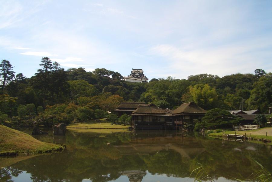 ↑玄宮園と彦根城天守閣