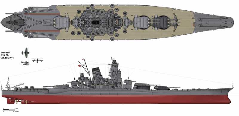 ↑1944年10月、最終時の戦艦武蔵(ウィキペディアより)