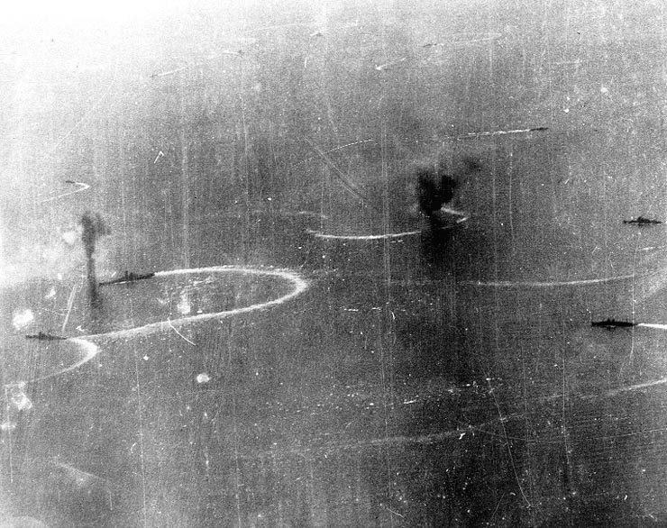 左側で回頭しているのは戦艦大和だが、その大和の航跡より、武蔵の航跡の方が薄い事から被害を受けて速力が低下している事が覗える。