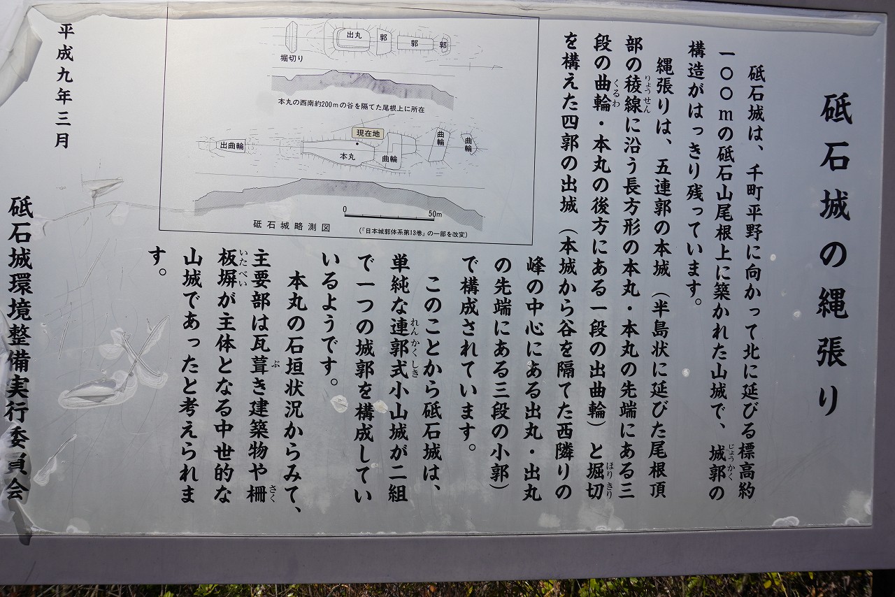 砥石城は、文明12年(1480年)頃、備前の守護代、浦上氏によって築かれたとみられる。標高約100mの砥石山の山上部にあって、眼下に広がる千町平野と商都、福岡の町を押さえる要衝であった。砥石山の西南約200mにある尾根上にも、出丸と呼ばれる小城が築かれており、砥石城は本城と出丸とを一体として用いていた。当時は、瓦葺きの建物や板塀が建てられていたようだ。