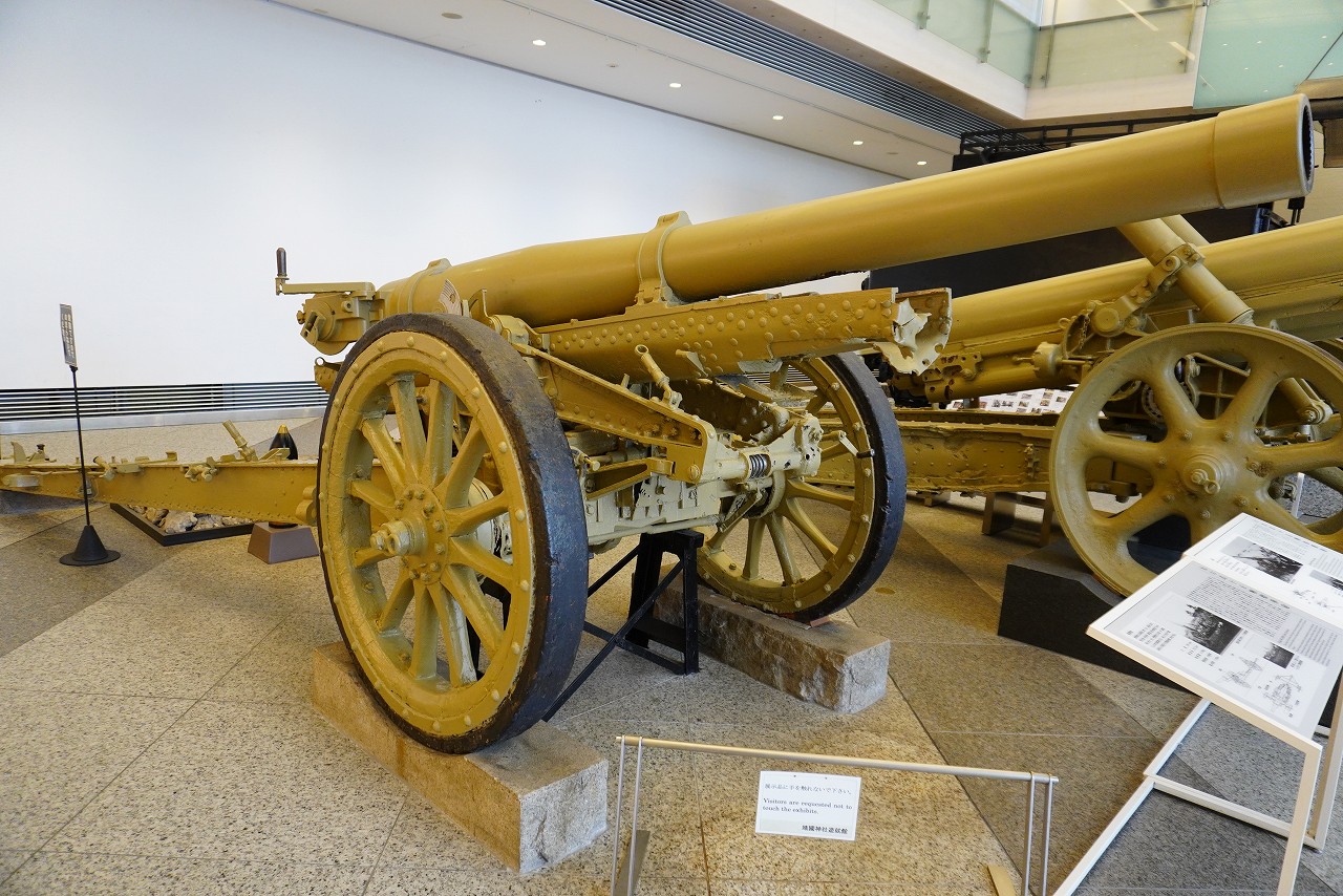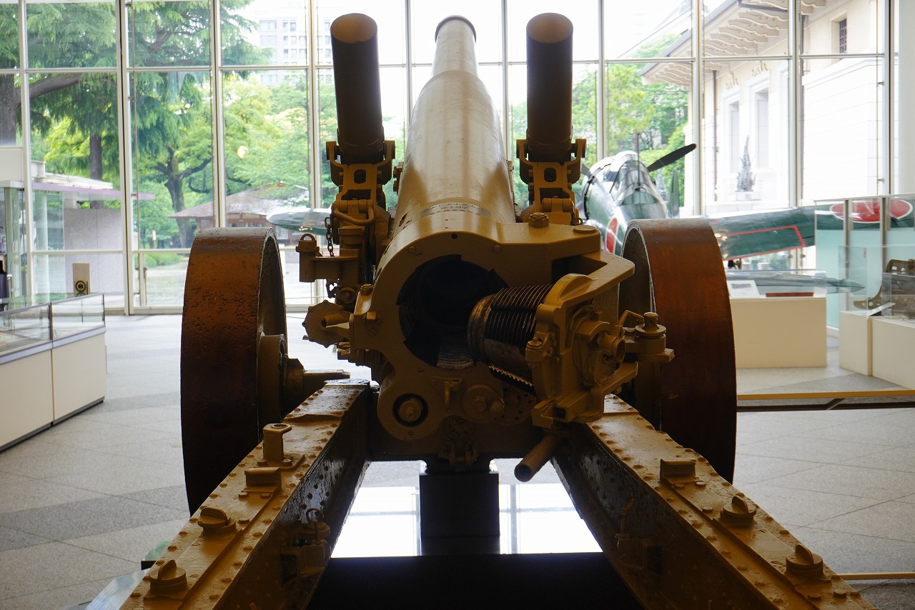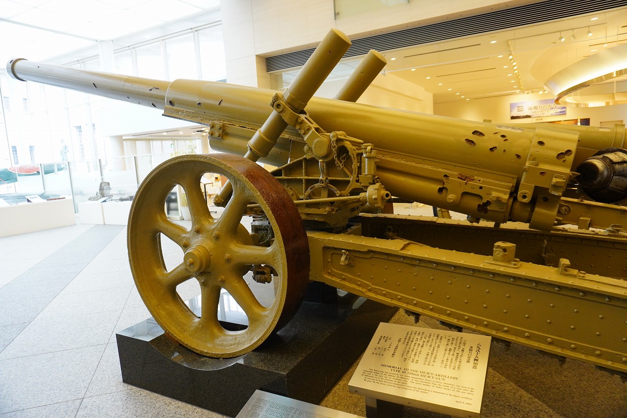 本砲は、独立重砲兵第百大隊に所属して沖縄戦に参戦しましたが、大隊は全滅し、戦後、洞窟内から発掘されました。砲身には無数の弾痕が穿(うが)かれています。