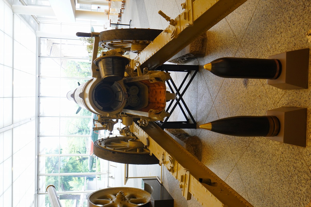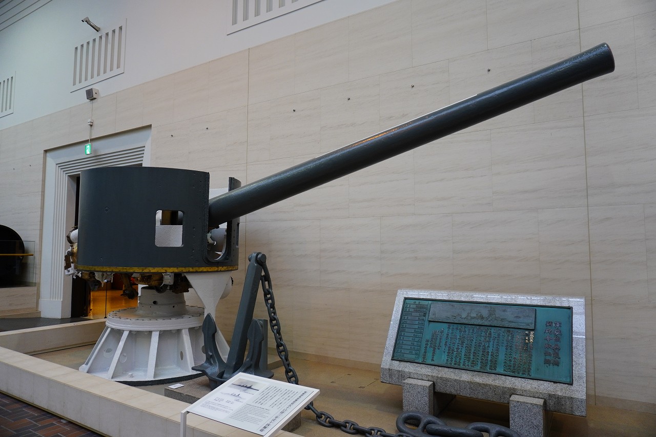 戦艦陸奥の副砲です。陸奥は長門型戦艦の2番艦で、大和型に次ぐ主力艦でしたが、昭和18年(1943年)6月8日、広島県柱島付近にて、不慮の大爆発を起こして爆沈しました。この砲は戦後、海底から引き揚げられたものです。