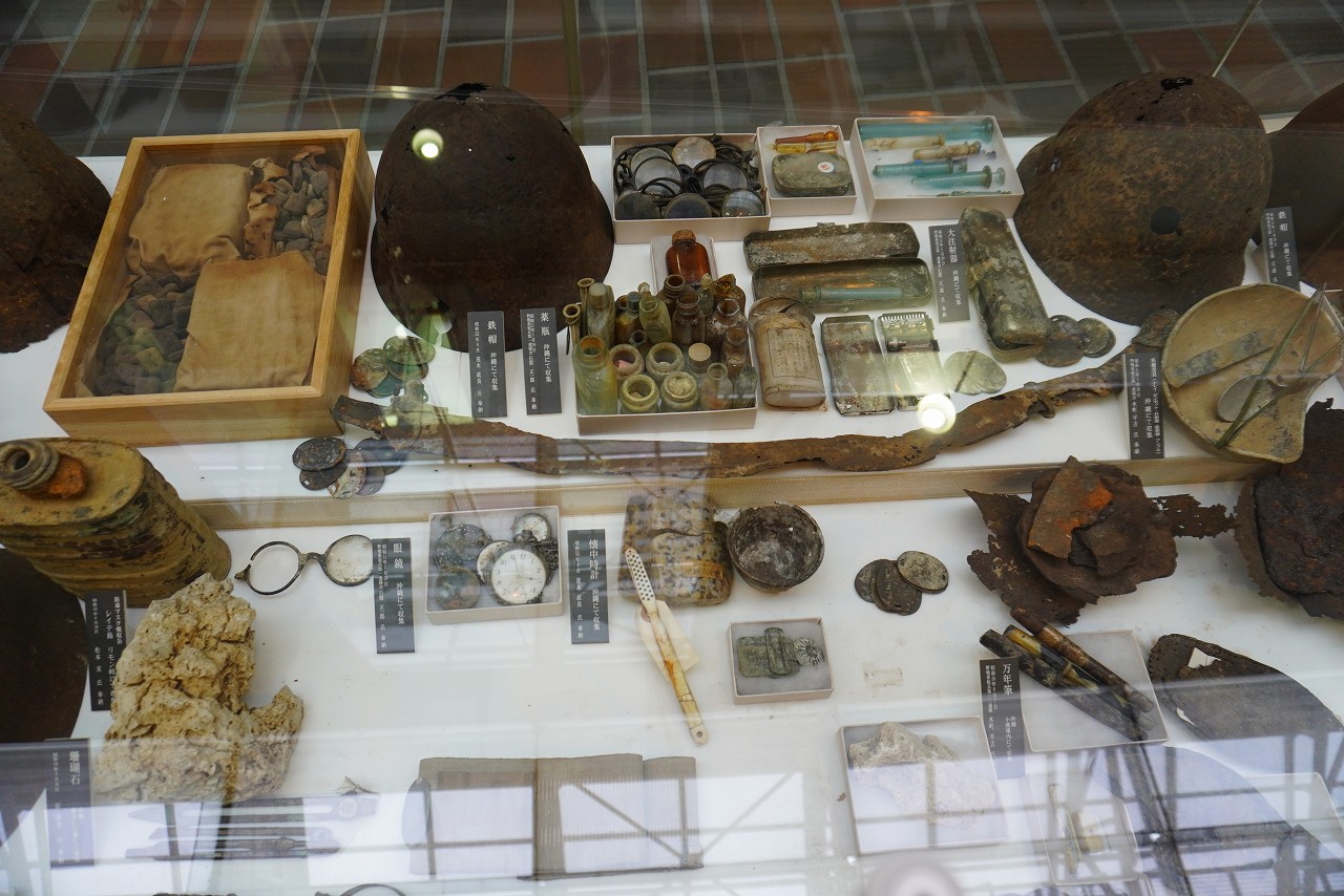 沖縄にて収集された、日本軍の遺品の数々です。銃弾が貫通した鉄兜、往時には当人が付けていたであろう眼鏡や懐中時計の数々が展示されています。生々しさに息を飲んでしまいます。合掌。
