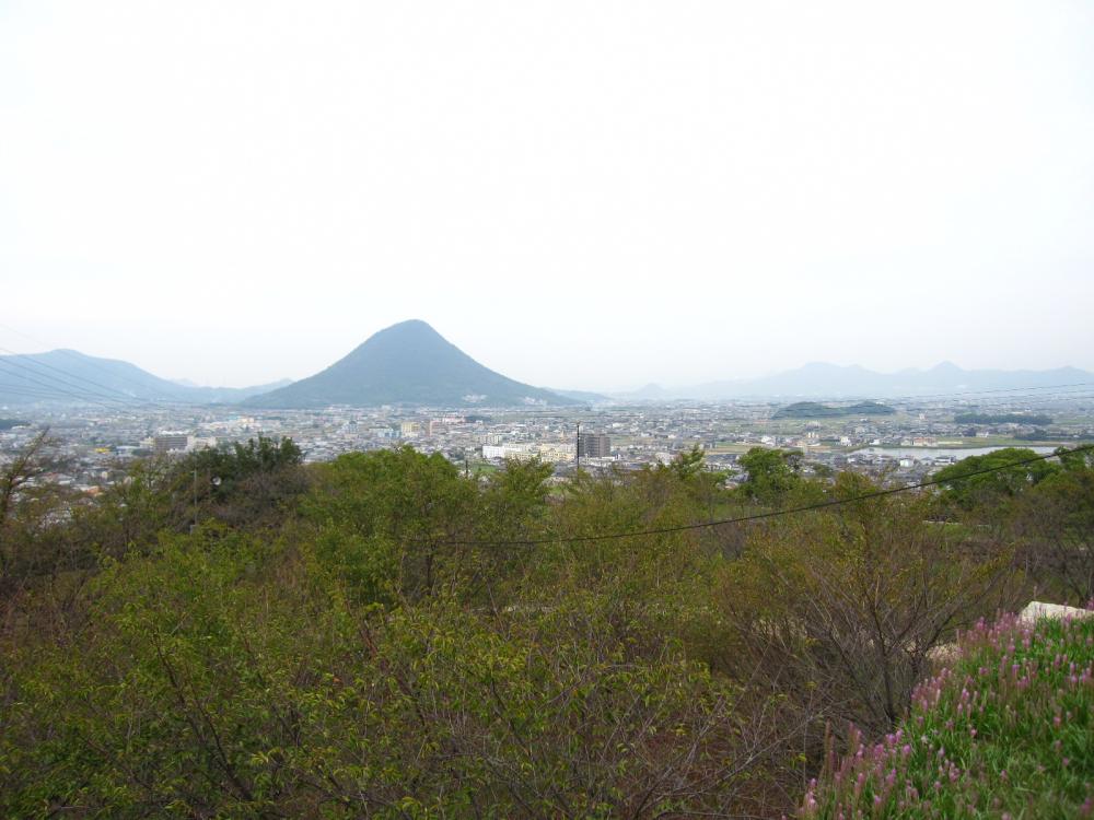 眼下の林は二の丸で、奥には讃岐富士(飯野山、標高421メートル)が見えます。