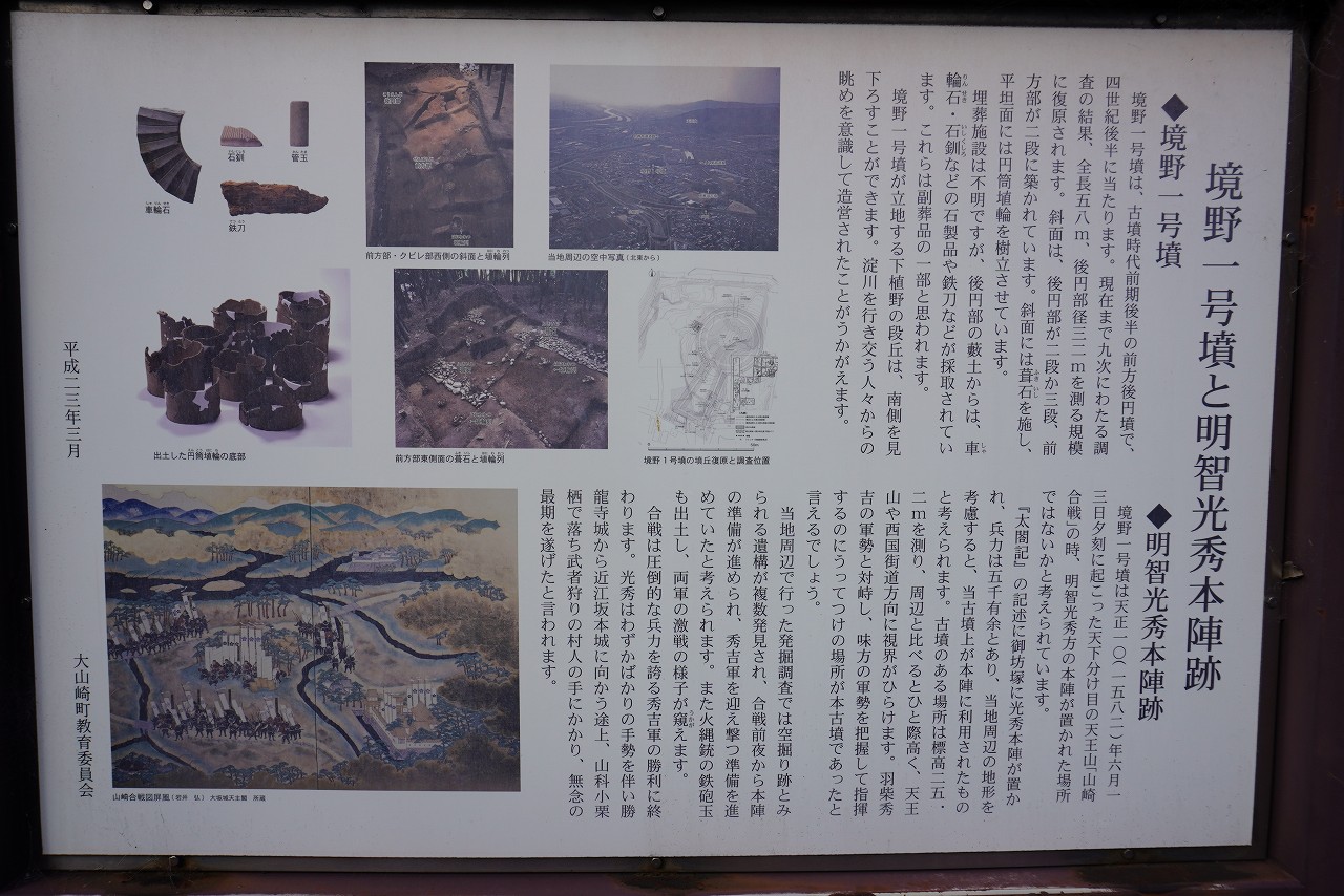 天正10年(1582年)6月13日、摂津国と山城国の境目、山崎の地にて、明智光秀と羽柴秀吉による天下分け目の決戦が行われた。両軍の兵力は、太閤記(江戸時代に書かれた秀吉の伝記)によれば、羽柴軍4万人、明智軍1万6千人、兼見卿記(吉田神社神主の吉田兼見の日記)によれば、羽柴軍2万人、明智軍不明であった。山崎は天王山と淀川に挟まれた狭い回廊で、京都側に抜ける通路も沼沢地が広がる地形で、大軍の機動は制限されていた。明智軍はその通路を防ぐ形で陣取り、光秀自身は御坊塚に本陣を置いた。円明寺川(小泉川)東岸には古墳が幾つか点在しており、明智軍はそれらを削平して陣城に仕立てていた。御坊塚もその一つであろう。