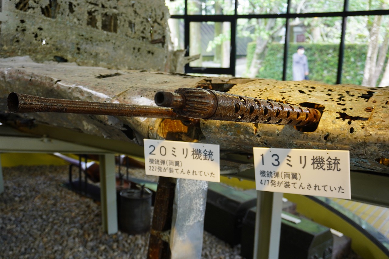 零戦の後期型で、速度と武装が強化されています。昭和20年(1945年)5月に鹿児島県、甑島(こしきしま)沖で海没した機体を、昭和55年(1980年)に引き揚げたものです。